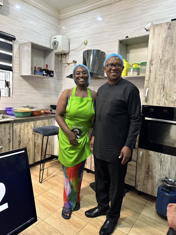 Former presidential candidate of the Labour Party, Peter Obi, on Monday, paid a visit to Chef Grace Nwaokobia as she seek to break the Guinness World Record for the longest home kitchen cooking marathon by an individual.