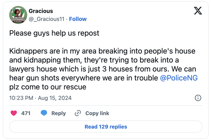 “Please guys help us repost. Kidnappers are in my area breaking into people’s houses and kidnapping them,” Gracious tweeted at 10:23 p.m. on August 15. “They’re trying to break into a lawyer’s house which is just three houses from ours. We can hear gunshots everywhere. We are in trouble.”