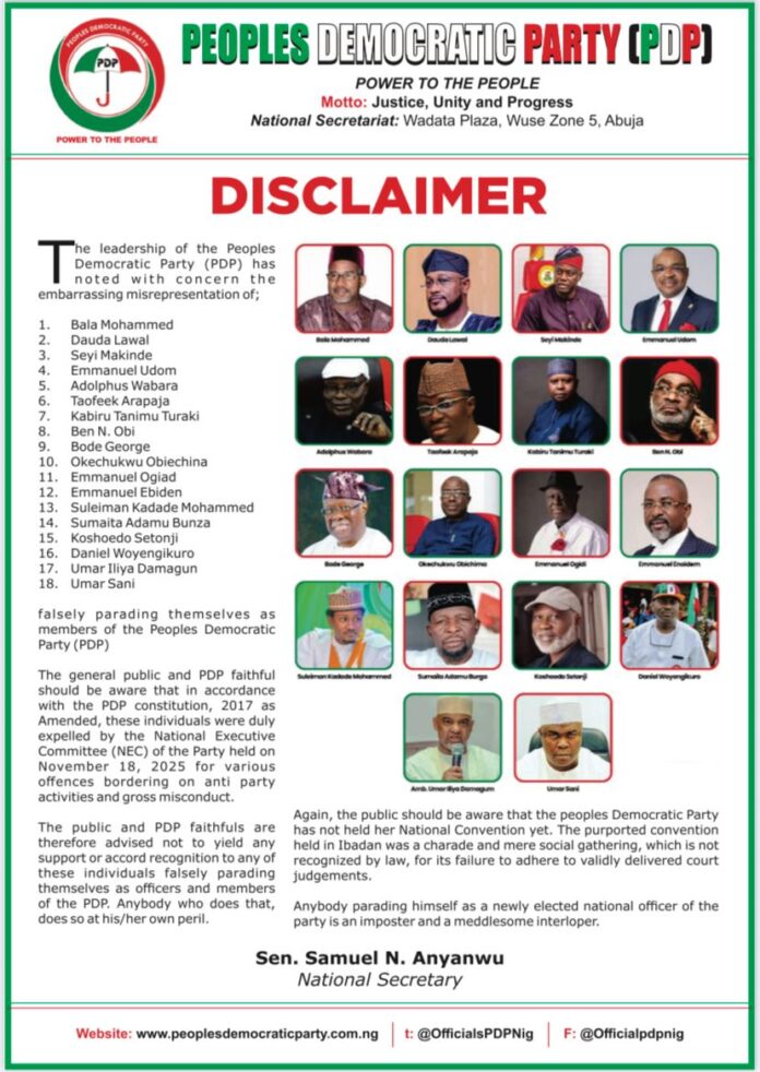 “The leadership of the Peoples Democratic Party noted with concern the embarrassing misrepresentation of these individuals falsely parading themselves as members of the PDP,” the disclaimer read. It further cautioned the public and PDP faithful against supporting or recognizing the expelled members, warning that doing so would be at their own risk.